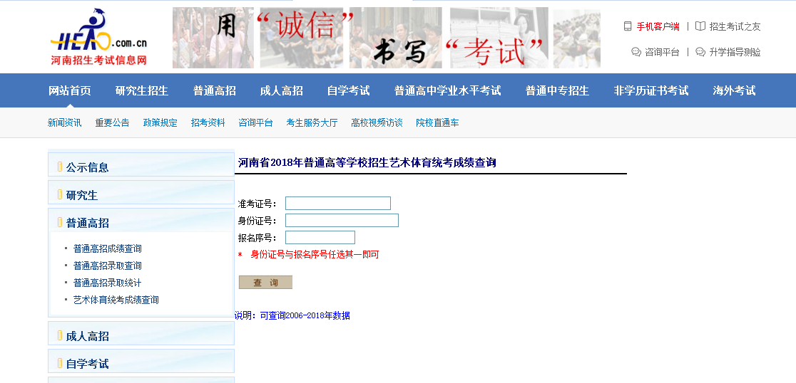 二是登录河南招生考试信息网(www.heao.com.cn)的成绩查询,进入"普通高招"中的"艺术体育统考成绩查询",输入考生信息即可查询2018年艺术省统考成绩。