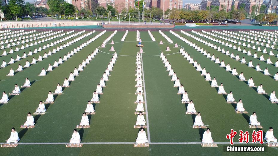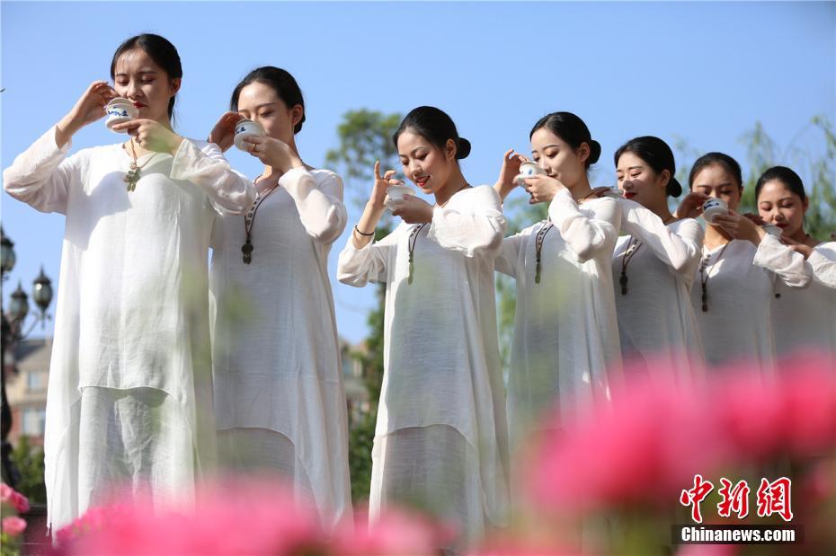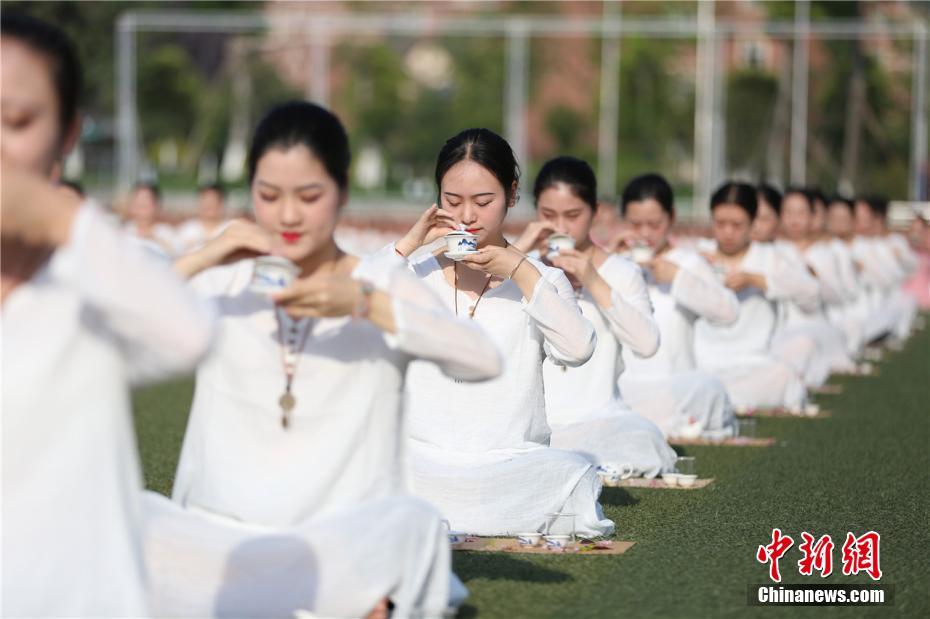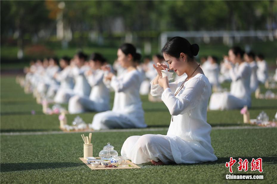 4月3日,四川西南航空学院航空服务专业的近千名学生进行茶艺展示,传承国粹。在现场,同学们一袭白衣、一杯绿茶,古风古韵非常吸引眼球。 钟欣 摄