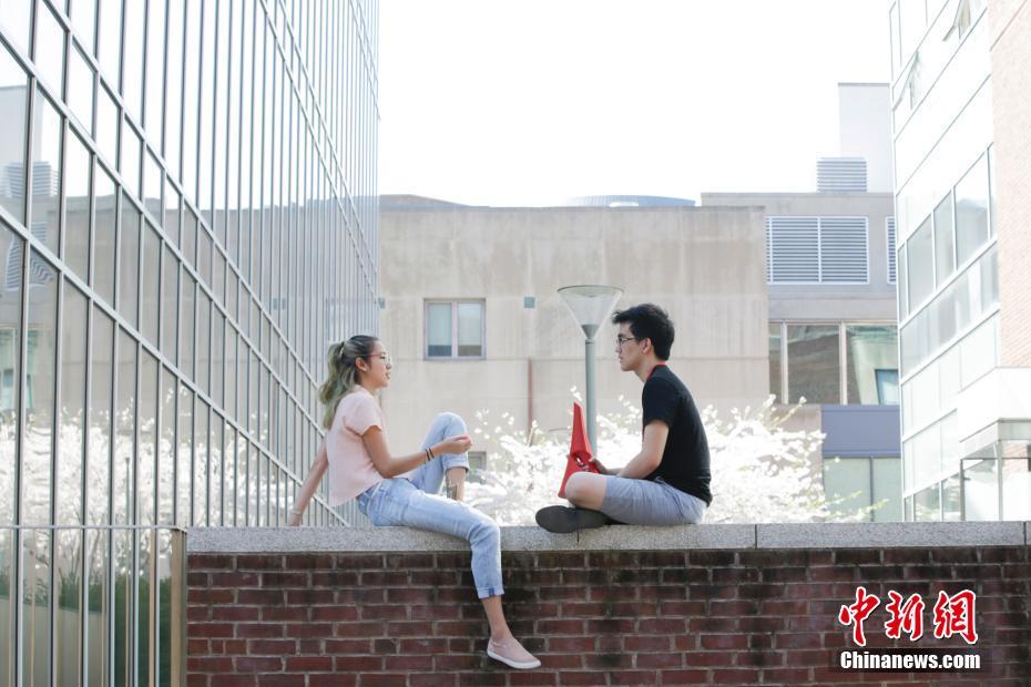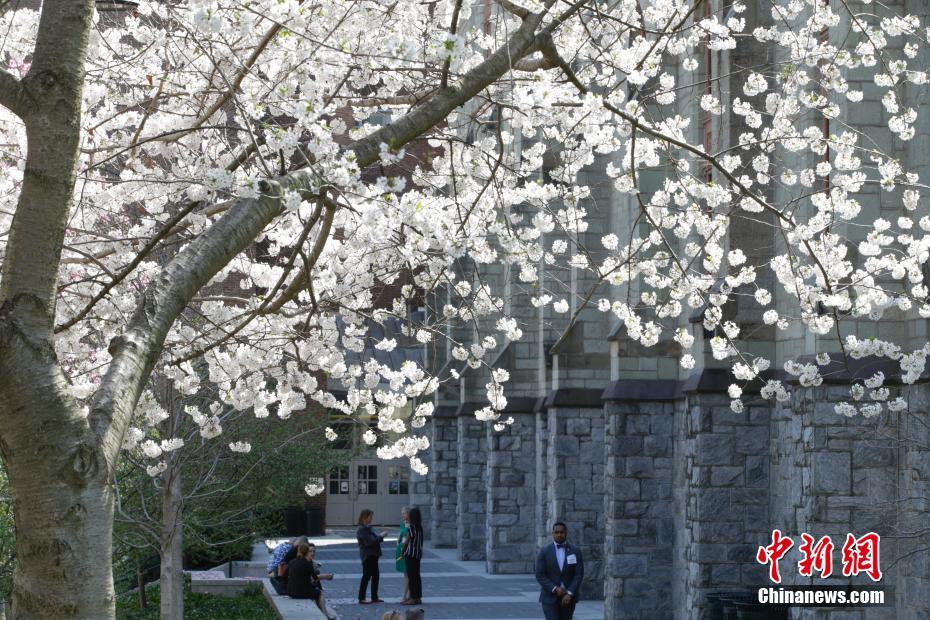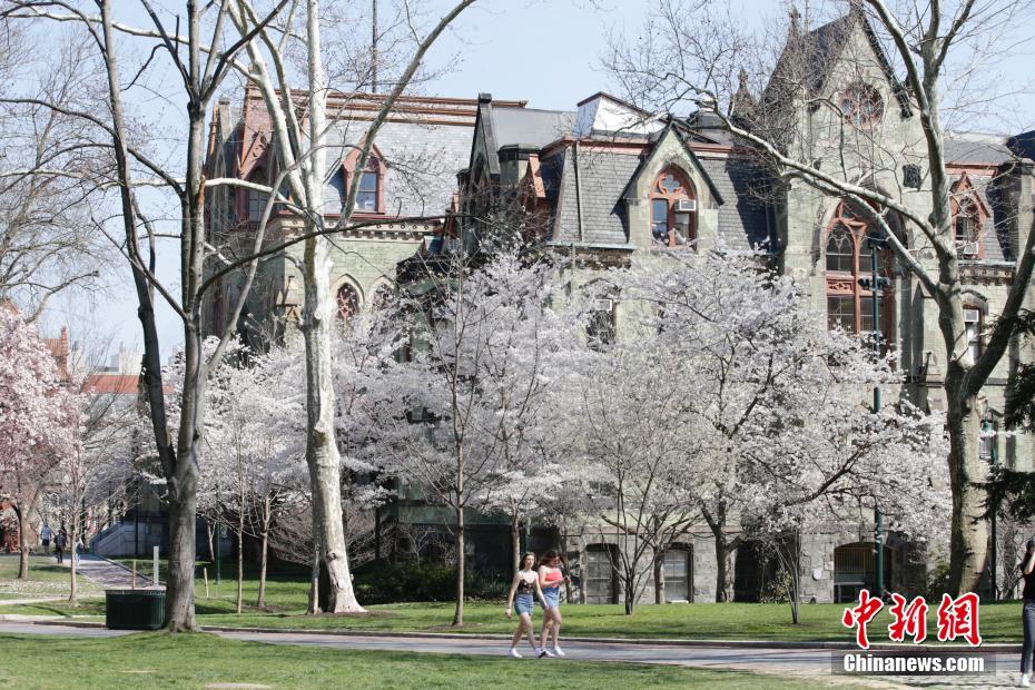 当地时间4月14日,美国费城宾夕法尼亚大学校园,学生在春花灿烂的校园中。中新社记者 廖攀 摄