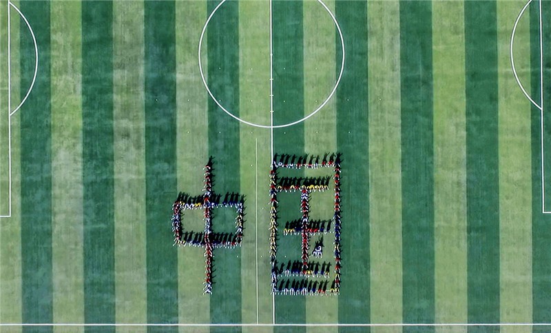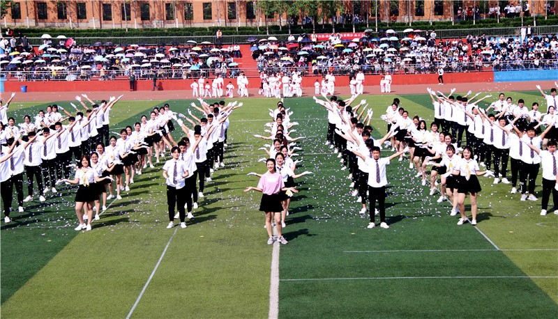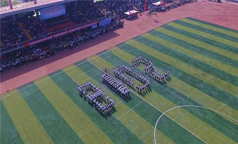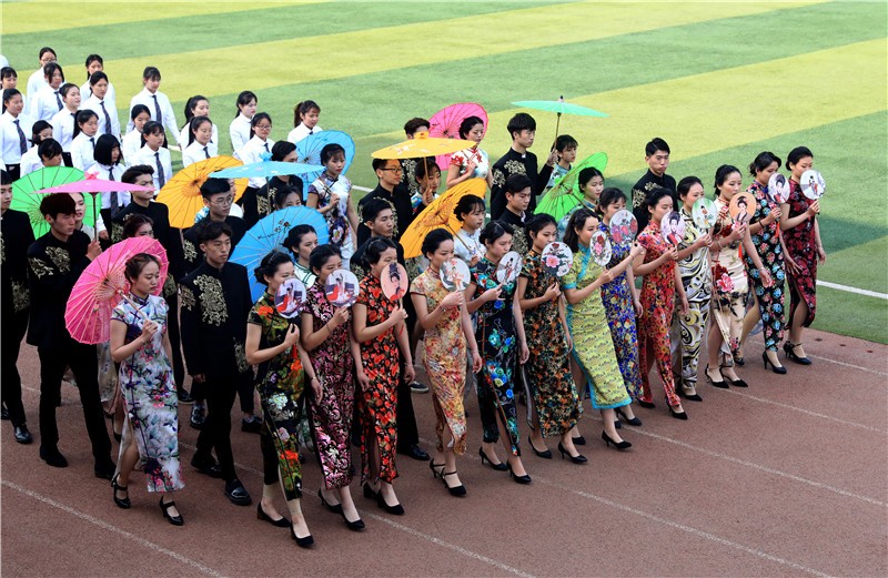 来自该校各个院系的大学生们整齐亮相,配以不同的服饰轮番展示炫舞、太极拳、旗袍秀、舞狮表演等,现场还壮观上演了航展及大型人体拼字"2018""中国"。当该校工管系学生持创办人王广亚博士巨幅手写体"商"入场时,全场一片肃静。