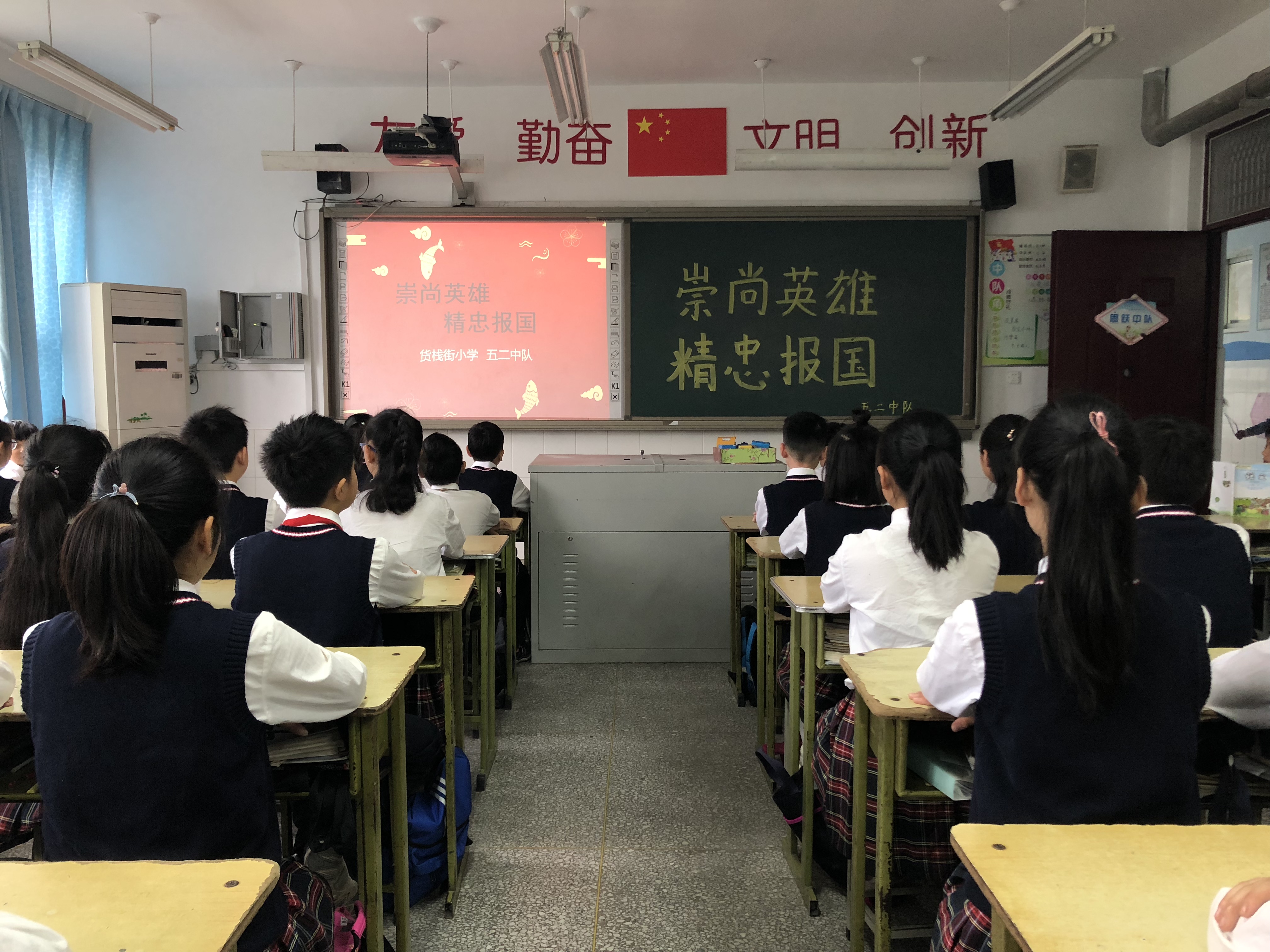 中队会上,全体少先队员进行了“出队旗,敬队礼,唱国歌”,并在中队辅导员的带领下观看《崇尚英雄精忠报国》宣传片。接着,中队辅导员请几位少先队员向大家向队员讲述了中国英雄刘胡兰、赵一曼、文天祥、王二小、黄继光的故事。其他队员们也纷纷讲起他们所知道的革命英雄的故事。除此以外,会上还开展了“诵读革命家书”“向英雄学习,说说身边的好榜样”“最美手抄报评选”“共同宣誓”等活动。