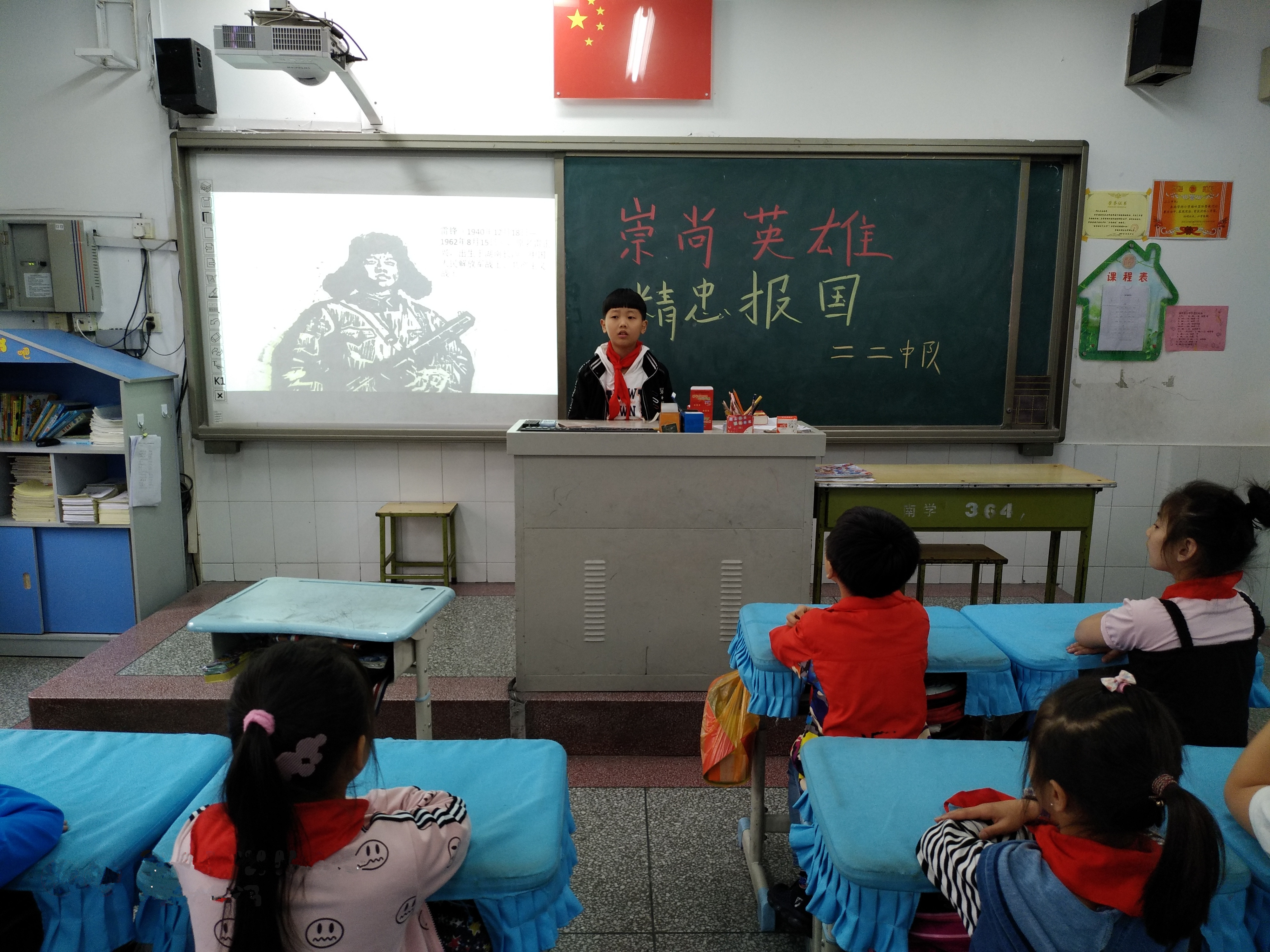 在交流环节,队员们积极和大家分享自己收集的来自各个领域的英雄故事,每一个英雄人物,每一件英雄事迹都深深印在了大家的心里。“我们今天的幸福生活真的是来之不易,我们应当珍惜现在的幸福生活,以英雄烈士为榜样,今天努力学习,明天报效祖国。”四二中队的赵兴向大家发出号召。