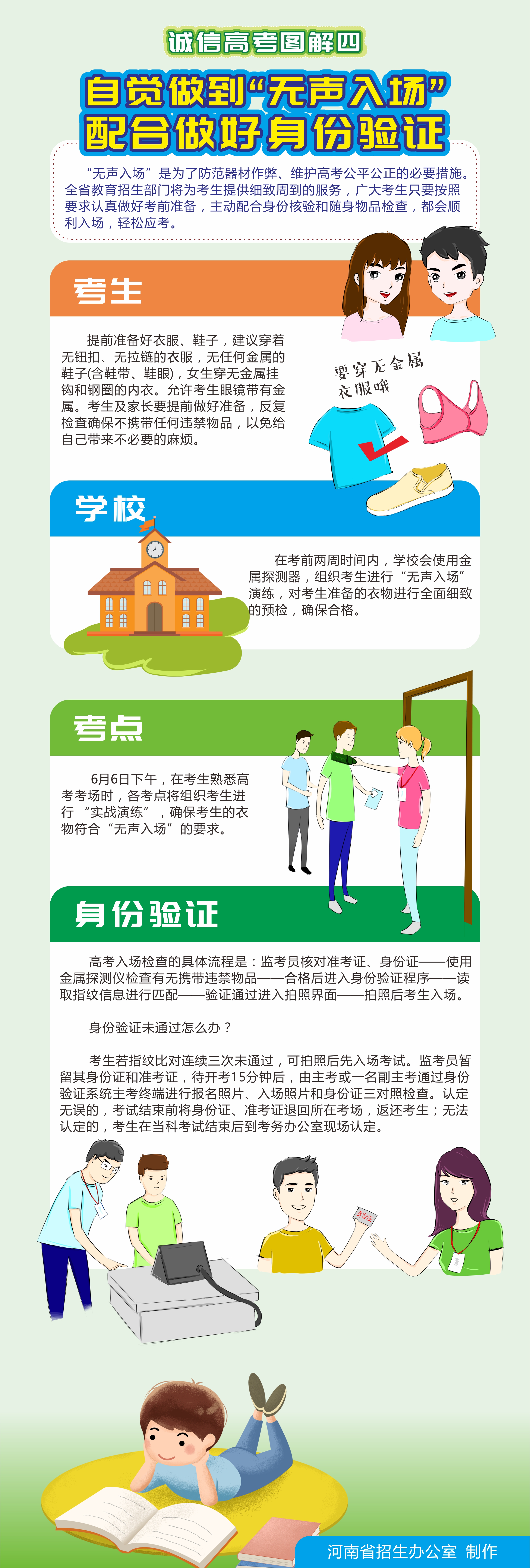 记者了解到,考生“无声入场”时,每个考场将设置一名女监考员负责金属探测检查。为保障考生入场顺利,建议考生提前准备好衣服、鞋子,建议穿着无金属纽扣、无金属拉链的衣服,无任何金属的鞋子(含鞋带、鞋眼)等。