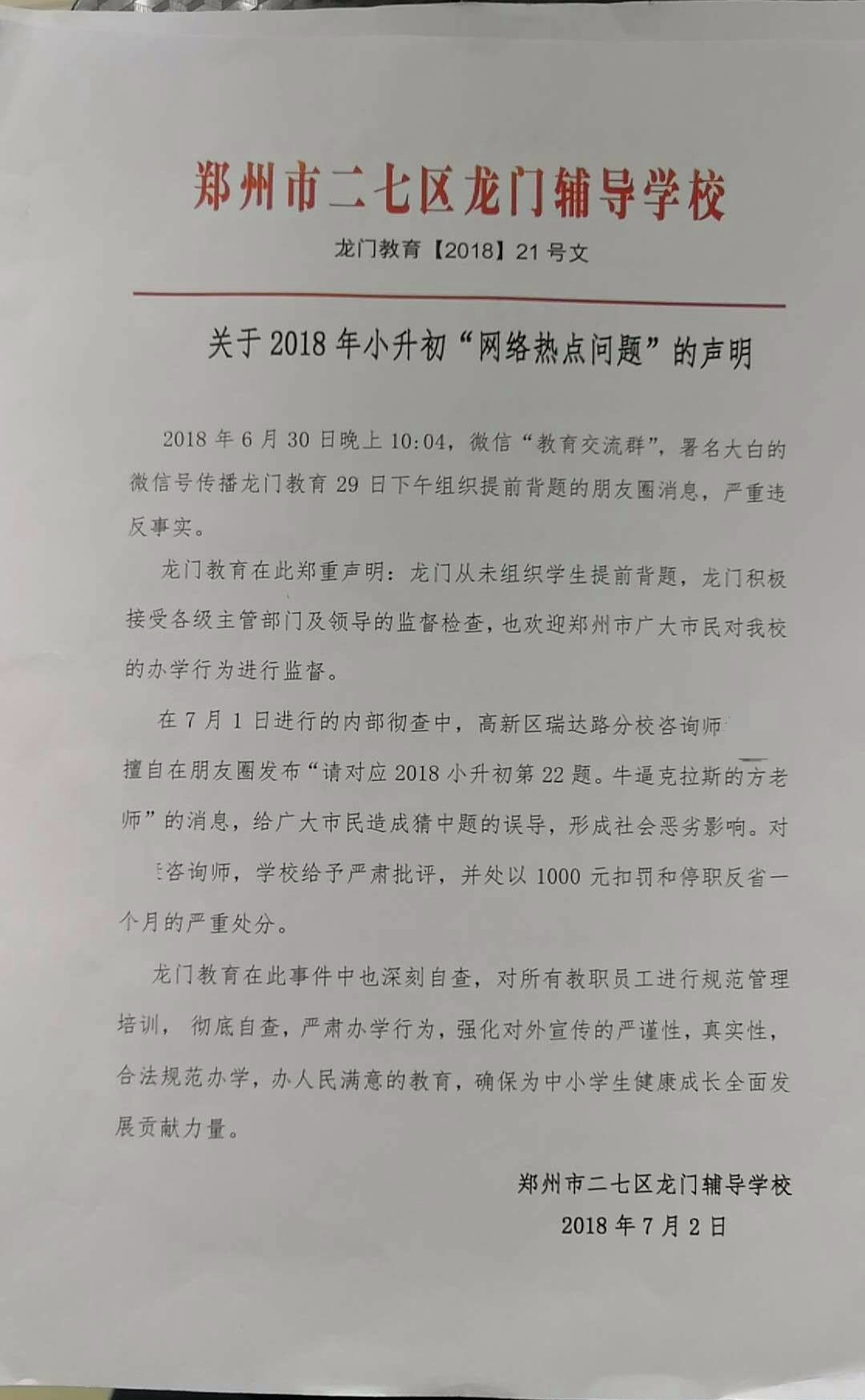龙门教育称:他们从未组织学生提前背题。在7月1日进行的内部彻查中,高新区瑞达路分校咨询师杨某,擅自在朋友圈发布“请对应2018小升初第22题”的消息,给广大市民造成猜中题的误导,形成社会恶劣影响。