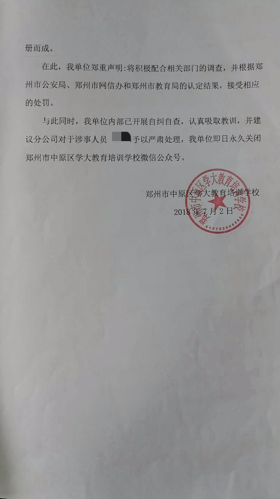 7月2日,郑州市教育局约谈网传中涉及到的民办培训机构,并责令其于当天下午做出书面情况说明。