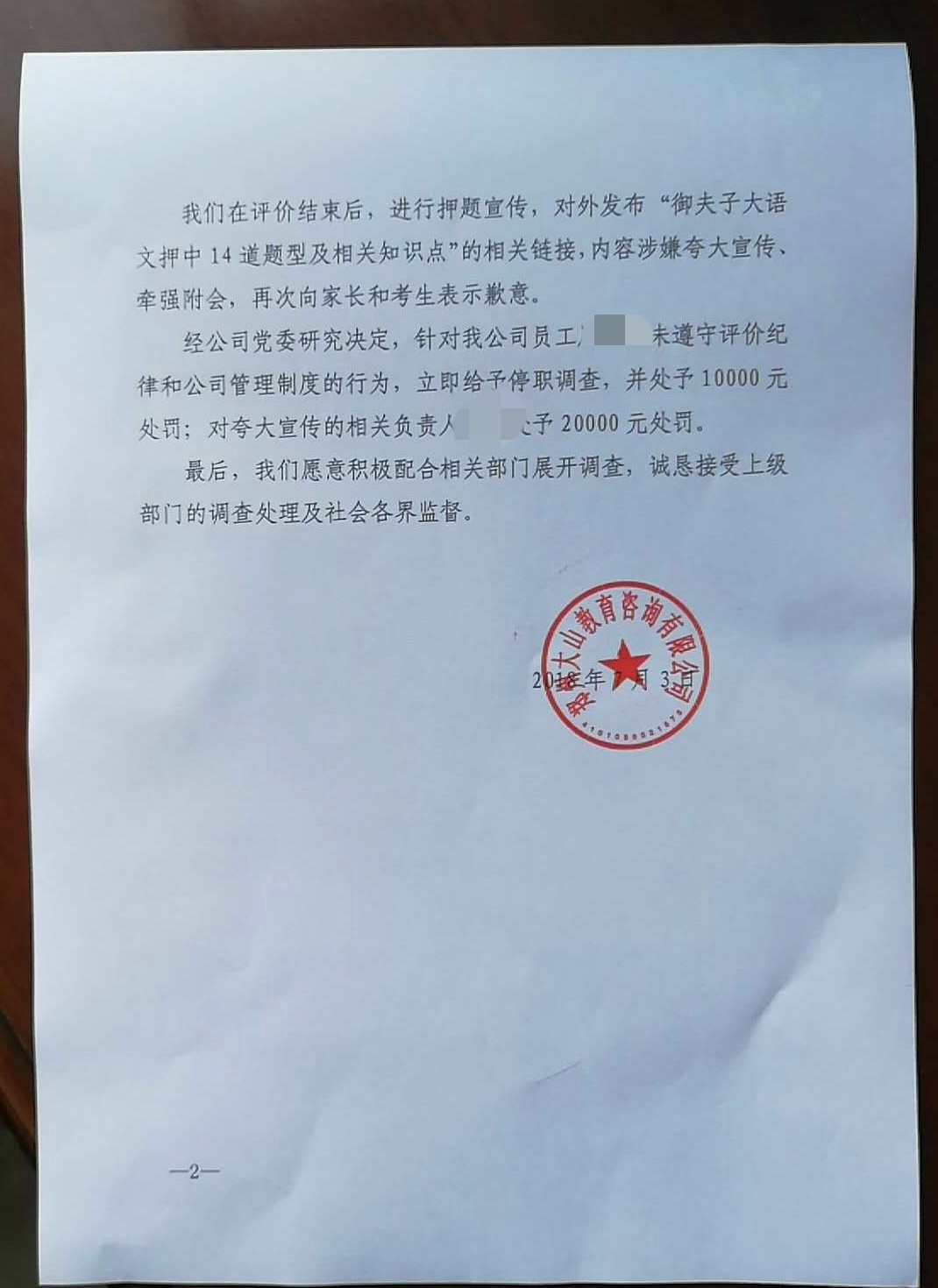郑州大山教育咨询有限公司称,公司员工唐某拿到抓拍试题后,立即组织教研人员进行解析,企图结合平时教学内容与评价内容相似之处,找到与日常内容相似的知识点,为招到更多学生做宣传,以谋取更大的收益。在评价结束后,进行押题宣传,对外发布“御夫子语文押中14道题型及相关知识点”的相关链接,内容涉嫌夸大宣传、牵强附会。