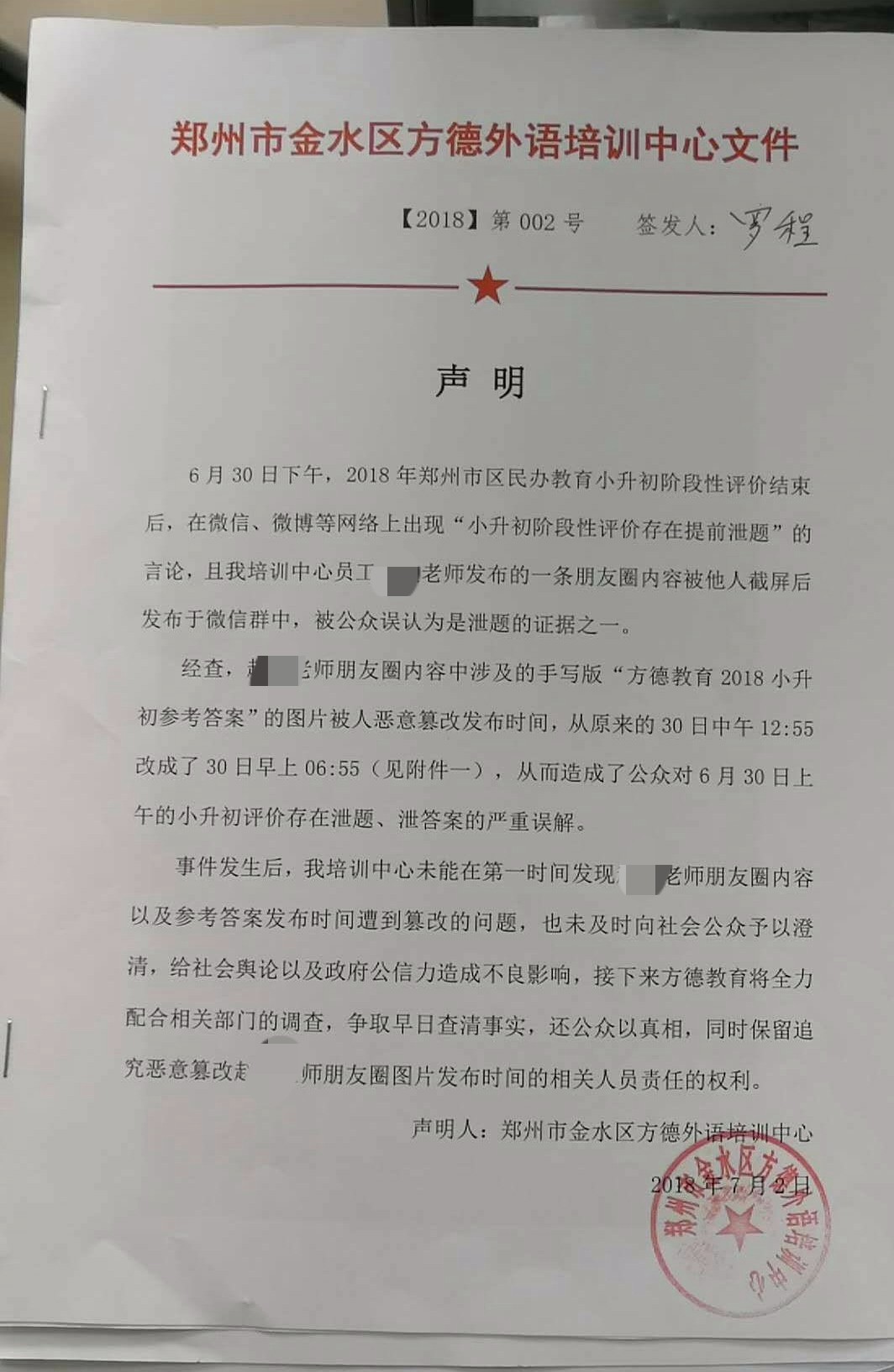 同时,方德教育声明,员工赵某朋友圈内容中涉及的手写版“方德教育2018小升初参考答案”的图片被人恶意篡改发布时间,从原来的6月30日中午12:55改成了早上06:55,致使公众对6月30日上午的小升初评价存在泄题、泄答案的严重误解。