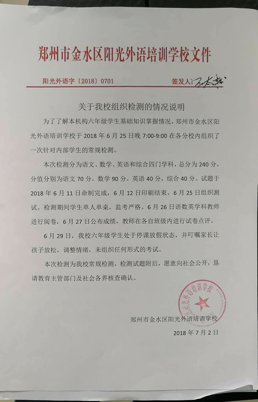 郑州市金水区阳光外语培训学校称,他们于2018年6月25日晚7:00—9:00在各分校内组织了一次针对内部学生的常规检测。6月27日公布成绩,教师在各自班级内进行试卷点评。6月29日,六年级学生处于停课放假状态,没有组织任何形式的考试。