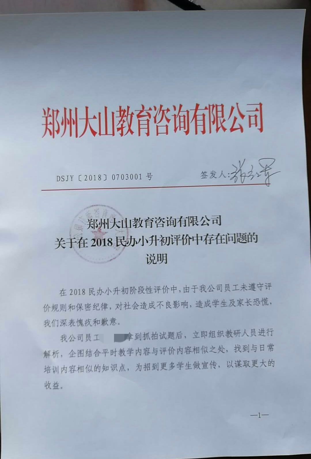 经调查,郑州市区民办初中阶段性评价考前不存在泄题,考中不存在作弊。