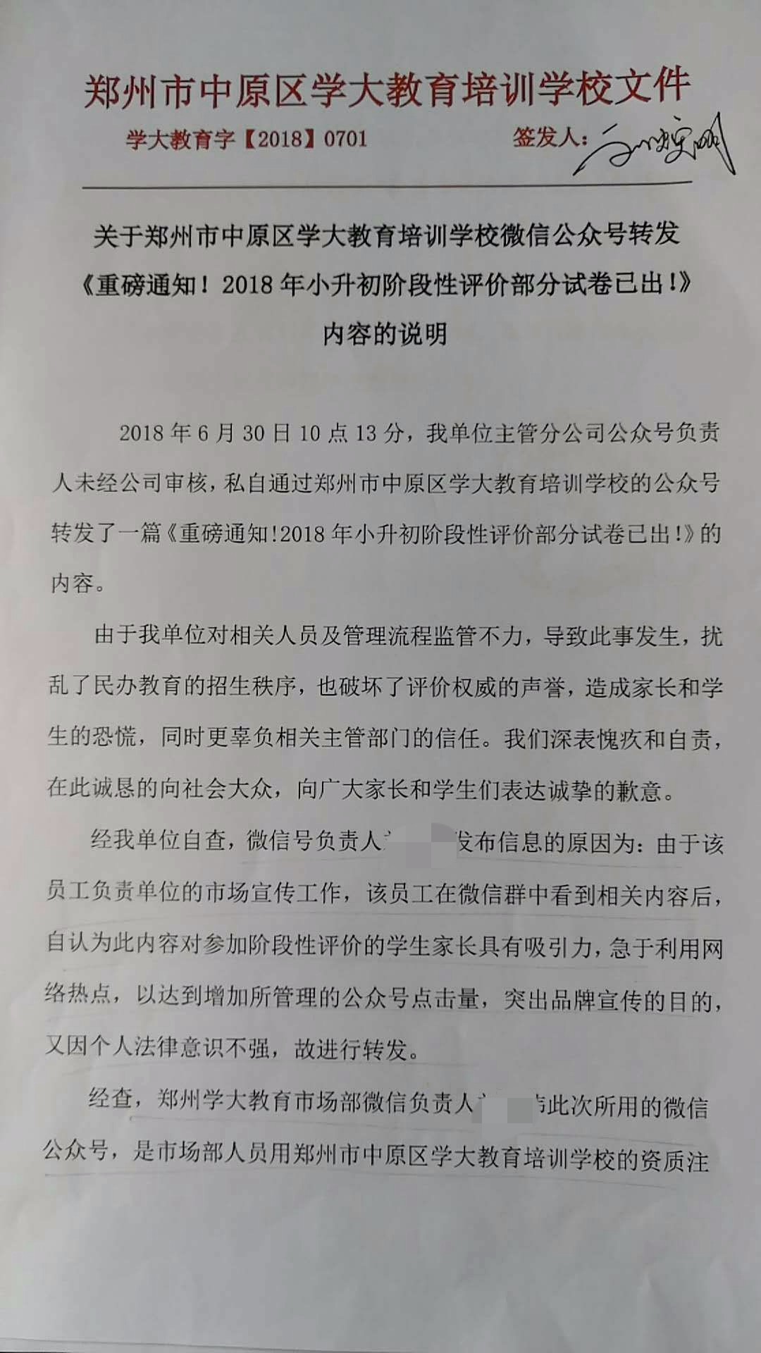 6月30日上午评价期间,郑州市中原区学大教育培训学校(以下简称学大教育)的微信公众号发布《重磅通知!2018年小升初阶段性评价部分试卷已出!》。经查,学校称:微信公众号负责人刘某在微信群中看到相关内容(注:评价内容)后,自认为此内容对参加阶段性评价的学生家长具有吸引力,急于利用网络热点,以达到增加公众号的点击量,突出品牌宣传的目的。学大教育在声明中称,对刘某进行严肃处理,并于即日起永久关闭郑州市中原区学大教育培训学校微信公众号。