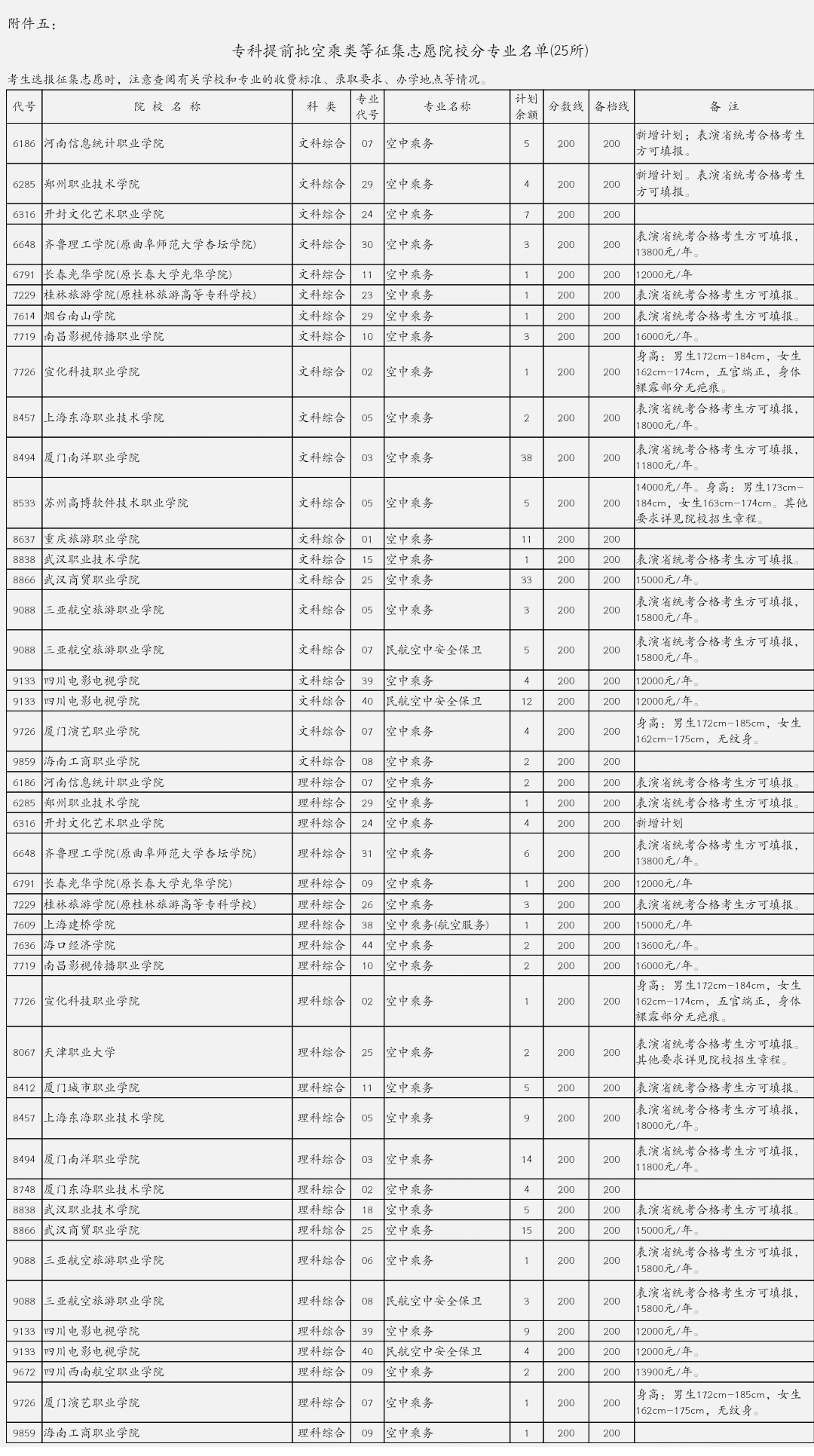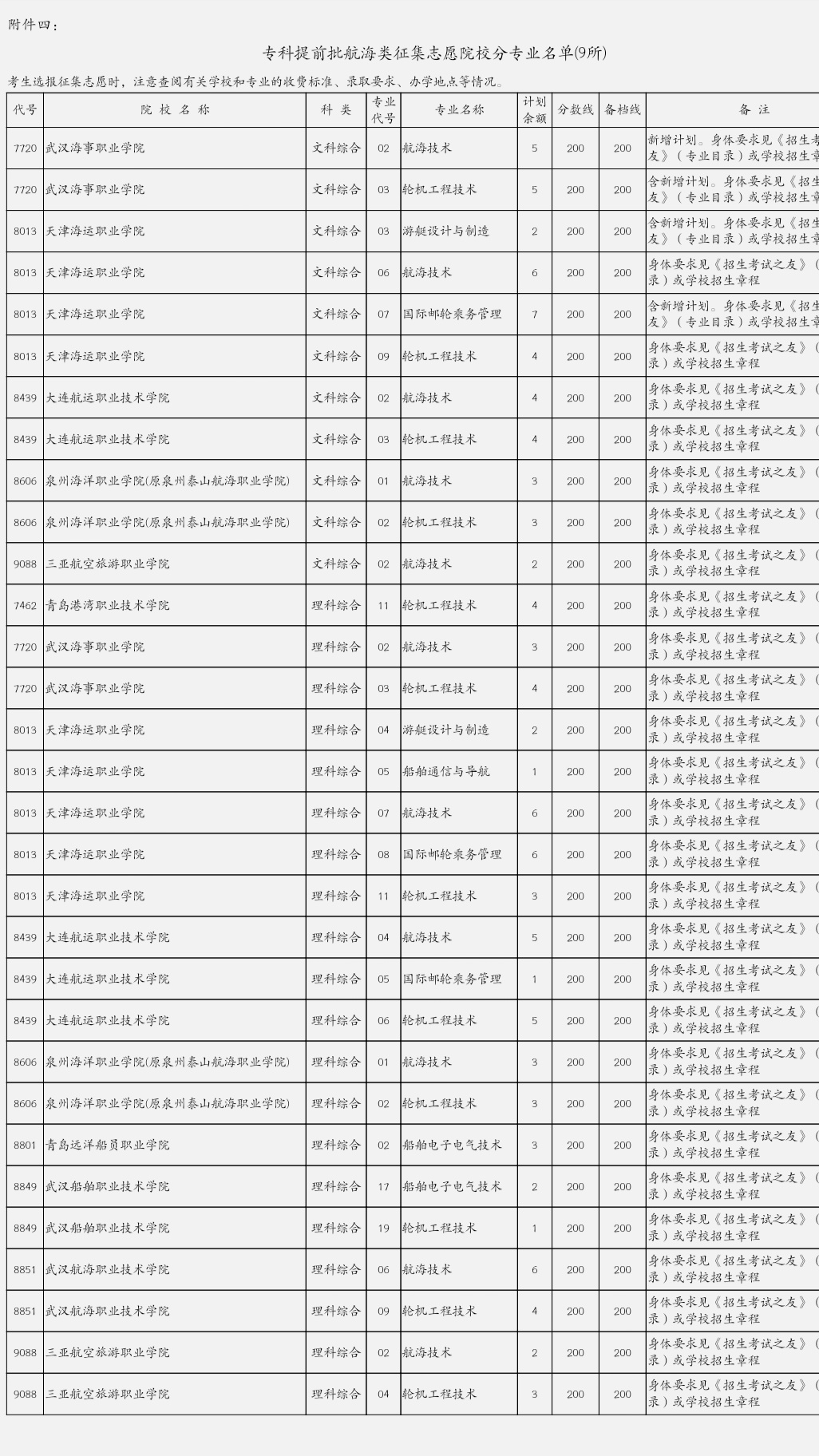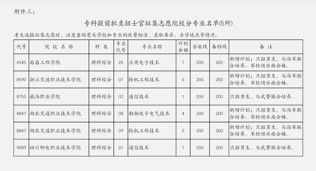 特别提醒考生的是,本批次招生大部分有特殊要求,如:直招士官要求考生参加省军区统一组织的体检、面试和政治考核合格;空乘类部分院校要求艺术类省统考表演专业合格,有的对考生身体条件有特殊要求;航海类对考生身体均有特殊要求。