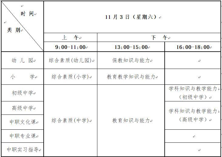 (一)网上报名时间:9月4日至7日17:00。(二)网上审核时间:9月4日至8日17:00。(三)网上缴费时间:9月4日至10日24:00。(四)全国统一考试日期11月3日,各类别考试科目与时间安排如下:
