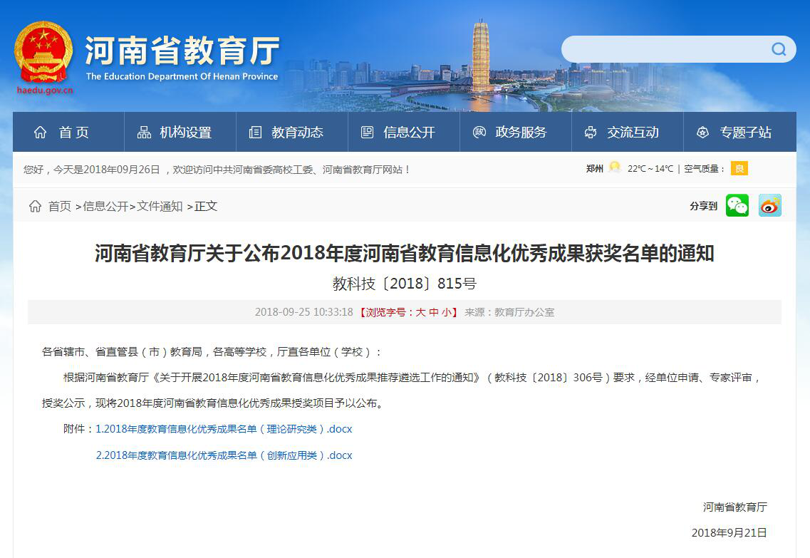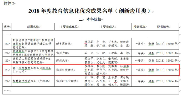 大河网讯 9月26日,记者从郑州科技学院获悉,该校在河南省教育厅近日公布“2018年度河南省教育信息化优秀成果获奖名单”(教科技〔2018〕815号)中获两项一等奖,其中理论研究类一等奖一项,应用创新类一等奖一项。