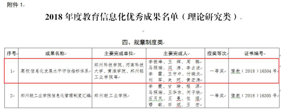 《高校信息化发展水平评估指标体系》获理论研究类一等奖。该项由多所高校共同完成,主要在基础设施、基础支撑平台、数字资源、智慧教育、治理体系、网络信息安全等6个方面,对高校信息化发展状况进行观测评估。河南省教育厅文件-教科技〔2018〕278号《河南省教育厅关于印发河南省高校信息化发展水平评估指标体系(试行)》的通知下发,标志着河南省教育厅正式采纳该标准,并正式实施。此次评估指标的发布,又将进一步加速河南省高校信息化工作整体提高。