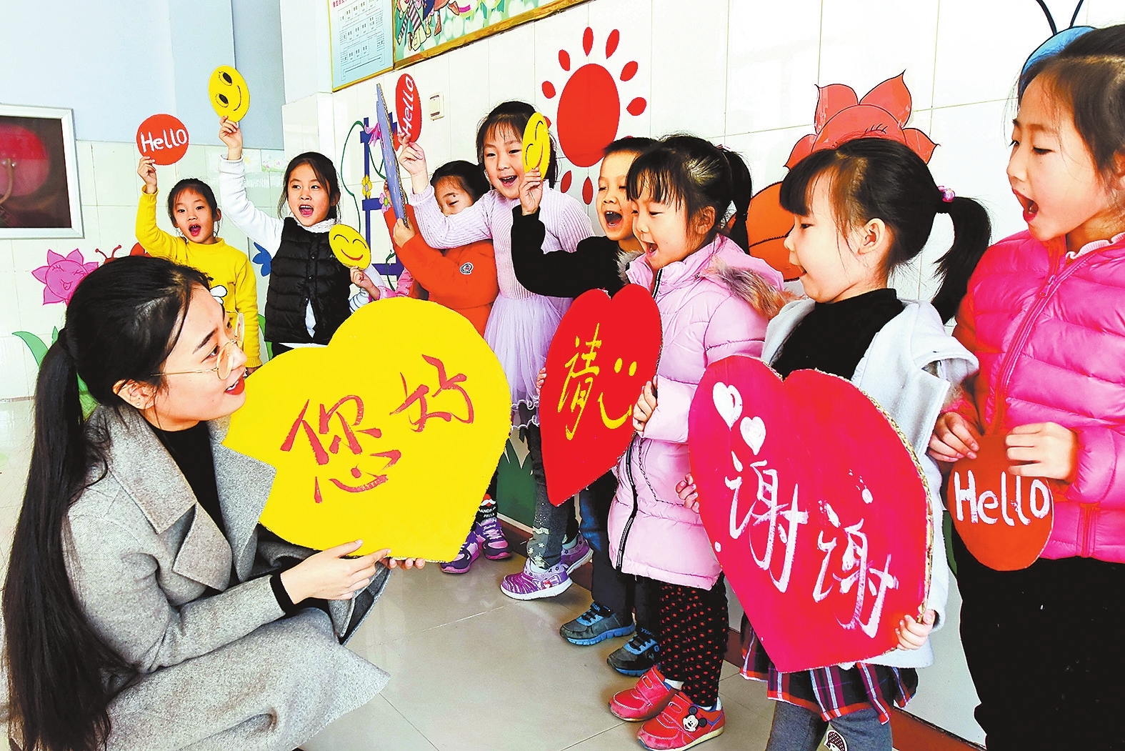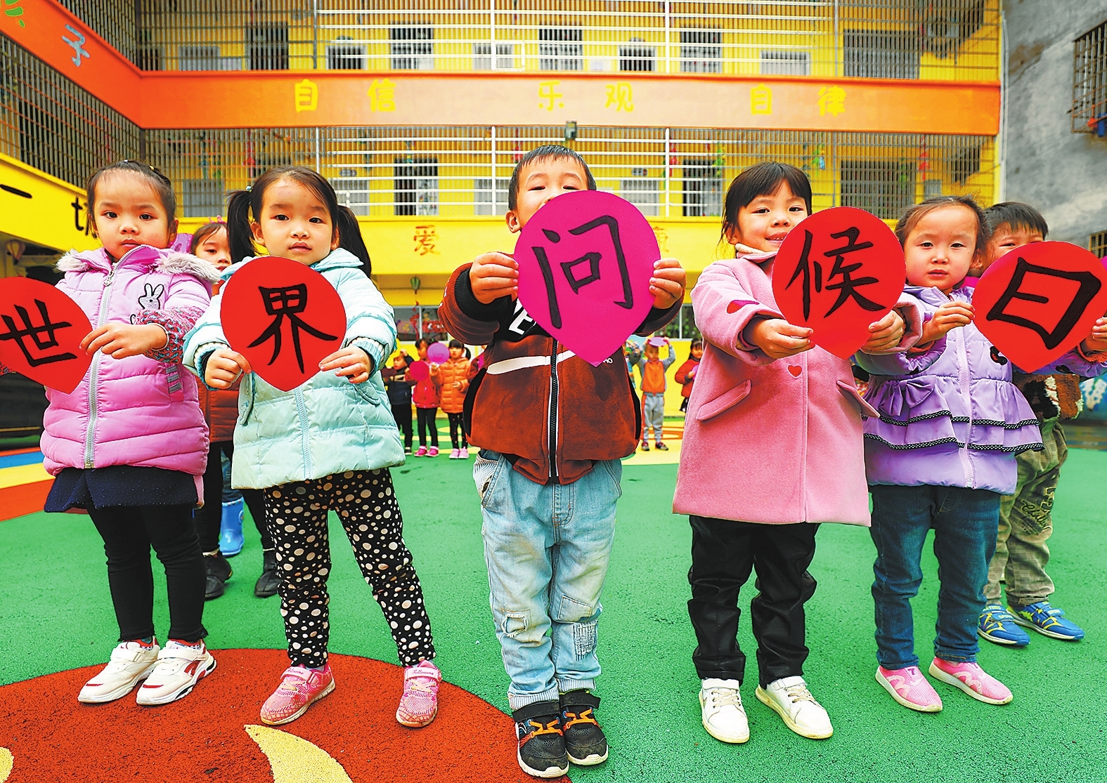 江西省泰和县一家幼儿园的小朋友们在展示“世界问候日”主题卡片。