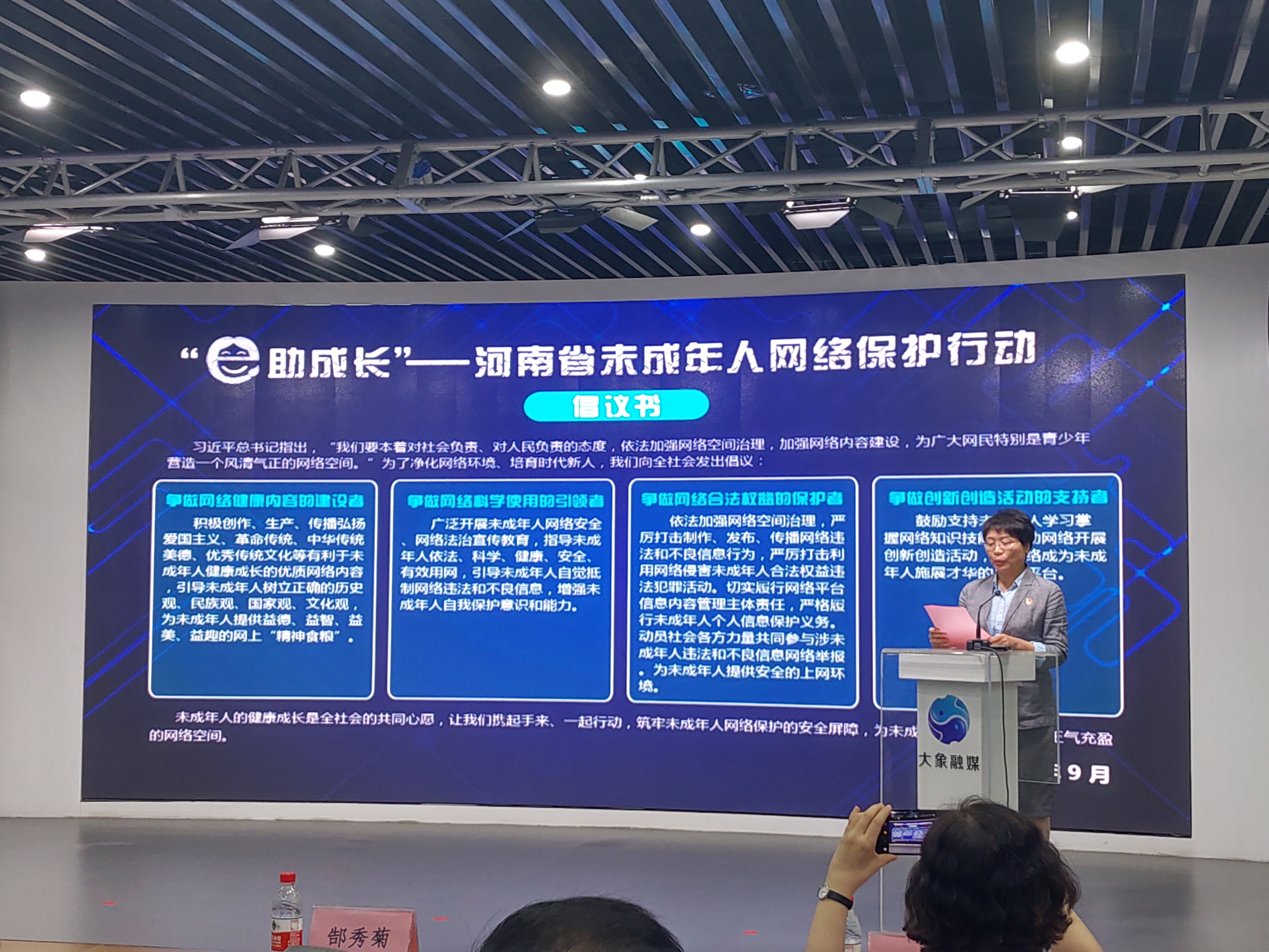 省妇联党组书记、主席郜秀菊宣读了《“E助成长”河南省未成年人网络保护行动倡议书》。相关单位参会领导在显示屏上共同签署电子签名,倡议大家要争做网络健康内容的建设者、网络科学使用的引领者、网络合法权益的保护者、创新创造活动的支持者。