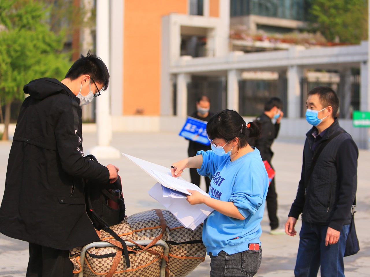 在大门口,不时传来行李箱滑轮滚动的声音,只见前来报到的学子们正在学校门口按秩序依次递交健康表,进行体温检查、资料核验。