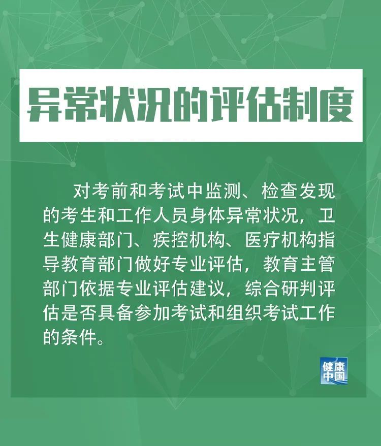 三是异常状况的评估制度。对考前和考试中监测、检查发现的考生和工作人员身体异常状况,卫生健康部门、疾控机构、医疗机构指导教育部门做好专业评估,教育主管部门依据专业评估建议,综合研判评估是否具备参加考试和组织考试工作的条件。