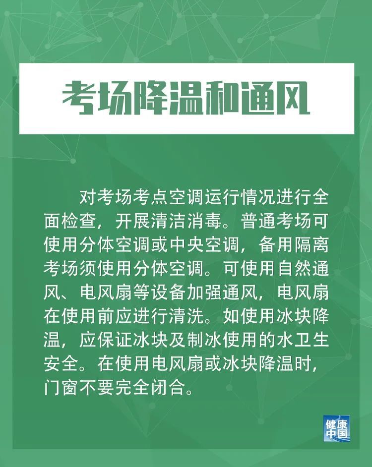 八是考场降温和通风。对考场考点空调运行情况进行全面检查,开展清洁消毒。普通考场可使用分体空调或中央空调,备用隔离考场须使用分体空调。可使用自然通风、电风扇等设备加强通风,电风扇在使用前应进行清洗。如使用冰块降温,应保证冰块及制冰使用的水卫生安全。在使用电风扇或冰块降温时,门窗不要完全闭合。