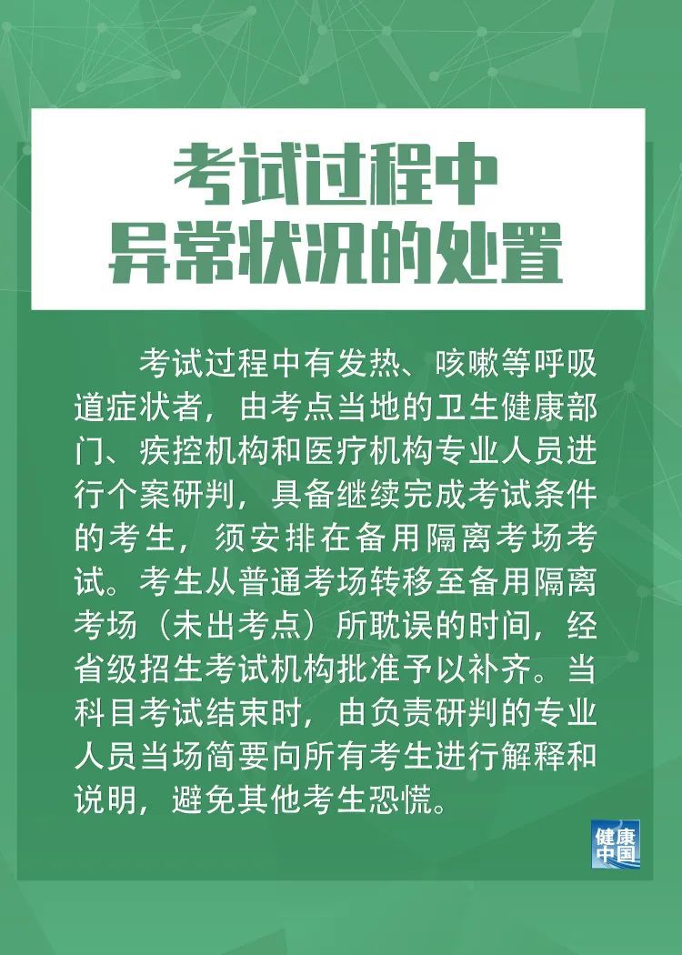 九是考试过程中异常状况的处置。考试过程中有发热、咳嗽等呼吸道症状者,由考点当地的卫生健康部门、疾控机构和医疗机构专业人员进行个案研判,具备继续完成考试条件的考生,须安排在备用隔离考场考试。考生从普通考场转移至备用隔离考场(未出考点)所耽误的时间,经省级招生考试机构批准予以补齐。当科目考试结束时,由负责研判的专业人员当场简要向所有考生进行解释和说明,避免其他考生恐慌。