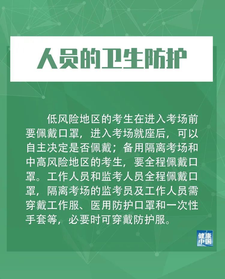 十是人员的卫生防护。低风险地区的考生在进入考场前要佩戴口罩,进入考场就座后,可以自主决定是否佩戴;备用隔离考场和中高风险地区的考生,要全程佩戴口罩。工作人员和监考人员全程佩戴口罩,隔离考场的监考员及工作人员需穿戴工作服、医用防护口罩和一次性手套等,必要时可穿戴防护服。