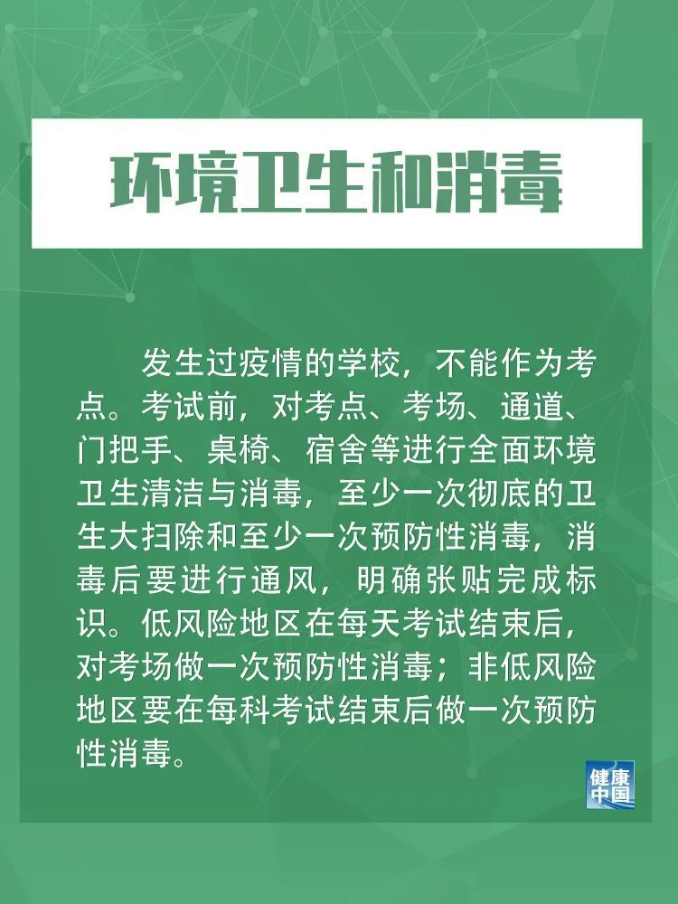 七是环境卫生和消毒。发生过疫情的学校,不能作为考点。考试前,对考点、考场、通道、门把手、桌椅、宿舍等进行全面环境卫生清洁与消毒,至少一次彻底的卫生大扫除和至少一次预防性消毒,消毒后要进行通风,明确张贴完成标识。低风险地区在每天考试结束后,对考场做一次预防性消毒;非低风险地区要在每科考试结束后做一次预防性消毒。