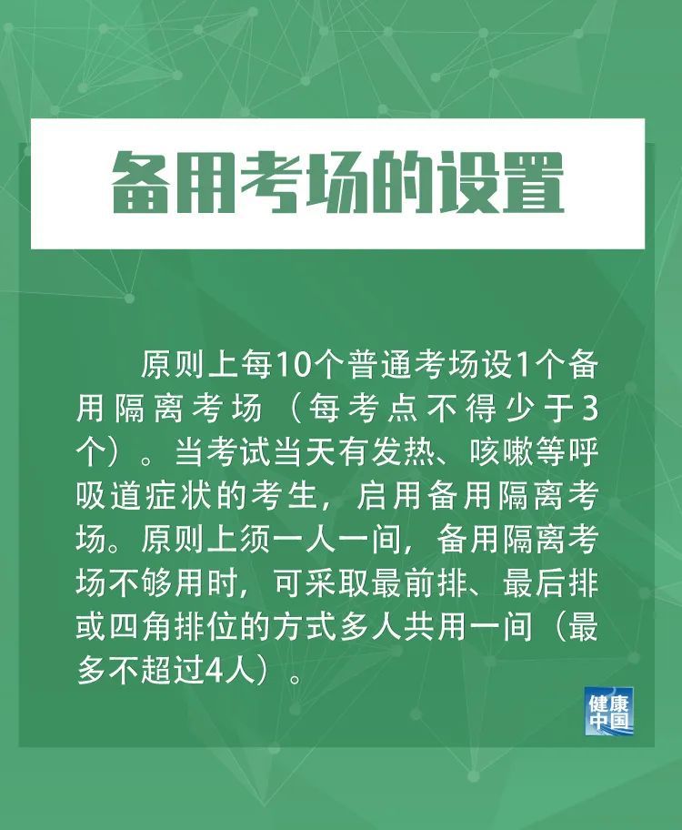 六是备用考场的设置。原则上每10个普通考场设1个备用隔离考场(每考点不得少于3个)。当考试当天有发热、咳嗽等呼吸道症状的考生,启用备用隔离考场。原则上须一人一间,备用隔离考场不够用时,可采取最前排、最后排或四角排位的方式多人共用一间(最多不超过4人)。