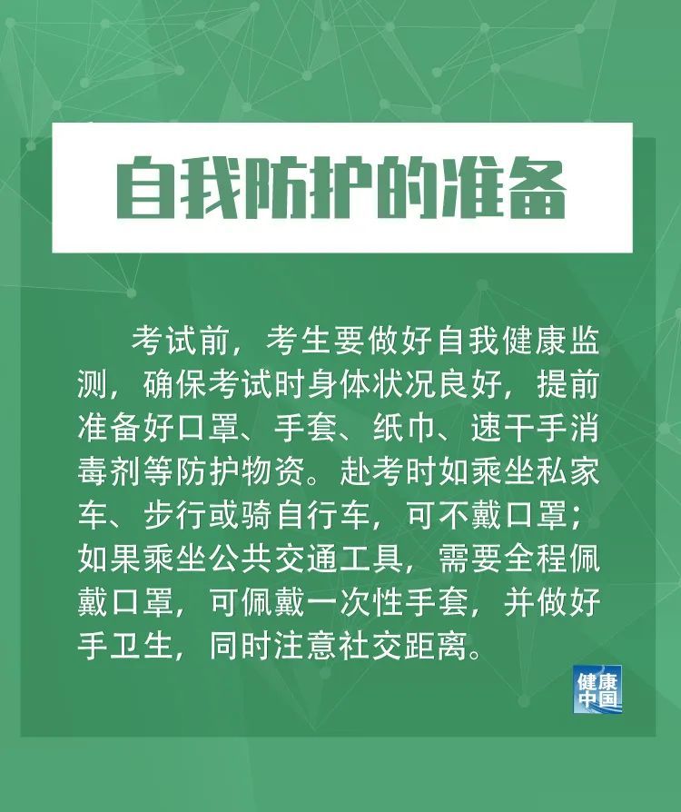 二是自我防护的准备。考试前,考生要做好自我健康监测,确保考试时身体状况良好,提前准备好口罩、手套、纸巾、速干手消毒剂等防护物资。赴考时如乘坐私家车、步行或骑自行车,可不戴口罩;如果乘坐公共交通工具,需要全程佩戴口罩,可佩戴一次性手套,并做好手卫生,同时注意社交距离。