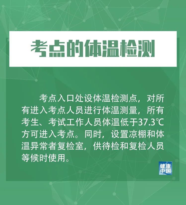 四是考点的体温检测。考点入口处设体温检测点,对所有进入考点人员进行体温测量,所有考生、考试工作人员体温低于37.3℃方可进入考点。同时,设置凉棚和体温异常者复检室,供待检和复检人员等候时使用。