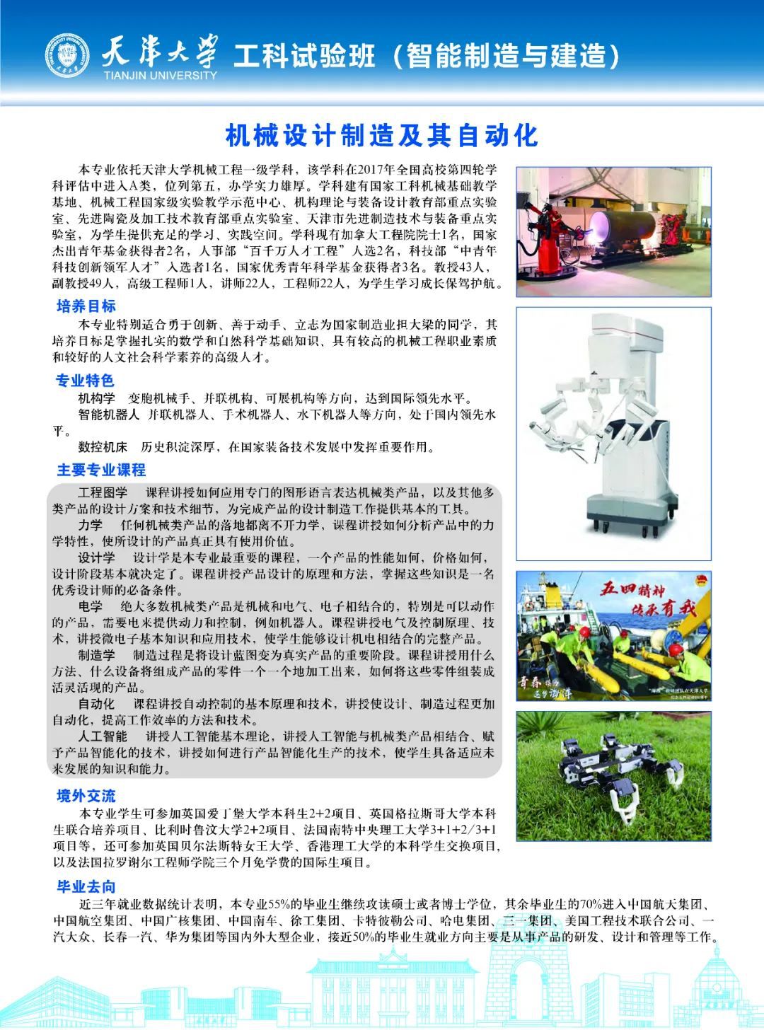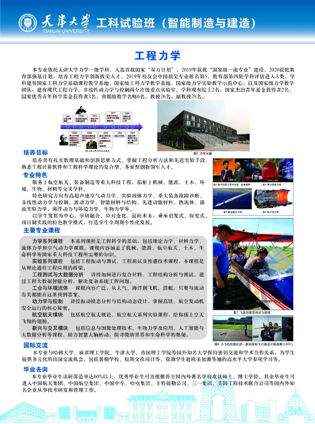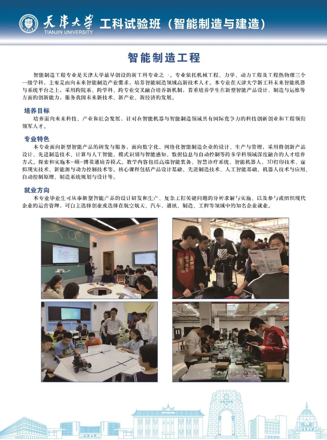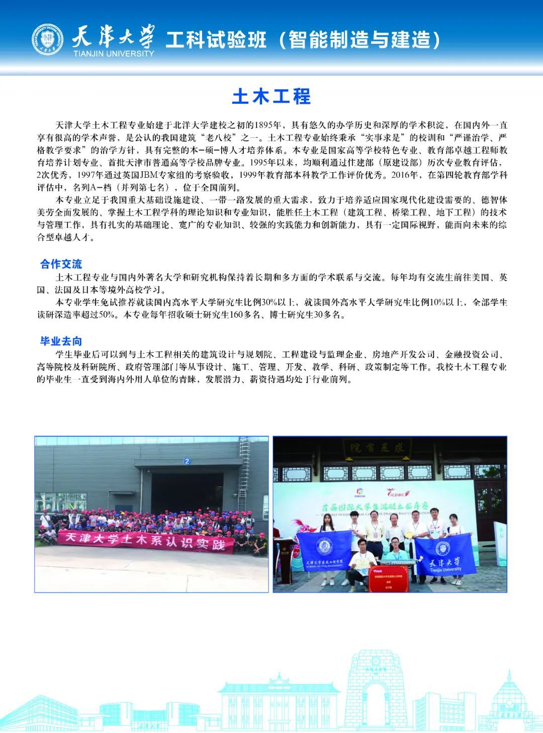 近年来,本大类紧盯未来工程学中智能制造与智能建造的前沿发展,充分发挥天津大学新工科未来智能机器与系统平台、国家重大科技基础设施建设项目“大型地震工程模拟研究设施”等各类国家顶级教学和科研平台,采用跨院系、跨学科、跨专业交叉融合培养新机制,着重培养学生在新型智能建造和建设所涉及的大工程交叉领域的创新能力与实践能力,服务我国未来新技术、新产业、新经济的发展。
