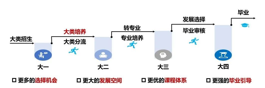 本大类实行导师制,每位入学新生都会有一名导师对其进行学业指导。学生第一年学习统一课程,在学习过程中,通过专业讲座、深入考察实验室和导师指导,了解各专业的特点、培养目标和发展方向。一年以后根据自身特点和志向,确认主修专业。进入主修专业学习后,如果发现专业不适合自己,还可以根据学校政策在全校范围转专业。