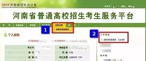 1、登录普通高招服务平台后,点击菜单栏的“填报志愿”菜单项,下拉菜单显示出“高职单招”的志愿。或者通过工作进度栏的“点击填报”直接进入填报页面(根据考生报考类型,显示稍有不同,有普通类和对口升学类两种)。如下图: