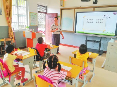 2017年,上林县为每个教学点都配备了白板和多媒体设备,刁望教学点告别了黑板和粉笔板书。“以前教学全靠自己琢磨,现在有多媒体教学资源,教学方便多了。”石兰松乐呵呵地说。