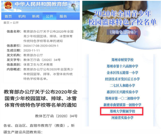 大河网讯 近日,教育部官网公示了全国青少年校园篮球、排球、冰雪体育传统特色学校认定结果。郑州大学附属学校(高新区)榜上有名,荣获“2020年全国青少年校园篮球特色学校”新称号。