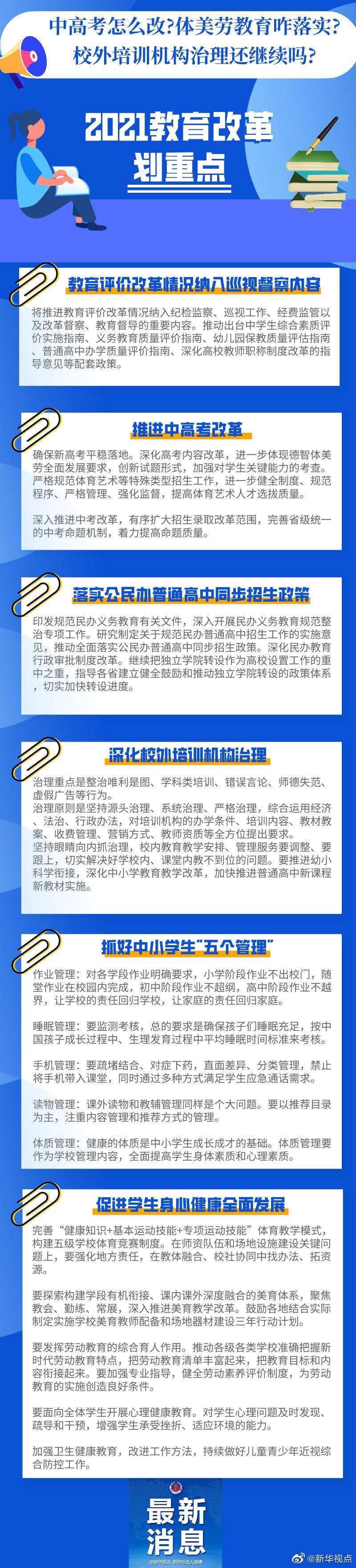 中高考怎么改?体美劳教育咋落实?校外培训机构治理还继续吗?中小学生作业、睡眠、手机、读物、体质都要纳入管理?这些社会关心的热点,在2021年教育发展改革中都将涉及。记者梳理教育部部长陈宝生在2021年全国教育工作会议上的讲话,及《教育部2021年工作要点》,为你划出以下重点。详情请见大图↓↓(记者 胡浩)