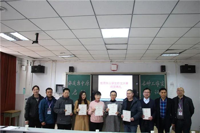 名师工作室核心成员、特级教师宋文峰跟大家分享了自己的心得体会:要想共创语文教研的良好生态,就要做到“四个有”,即有一个优秀导师团队的引领、有一群志同道合的同行者、有一些不断追赶超越的后来者、有一颗不甘平庸倦怠的事业心。彭双仓指出,名师工作室在帮助教师提高专业与理论水平的同时,更要提高名师工作室规划的可行性,立足于教育教学实践。两人的总结发言得到在场老师的一致认同。仪式最后,工作室为指导学生在“全球华人作文大赛”中取得优异成绩的老师颁发了证书。
