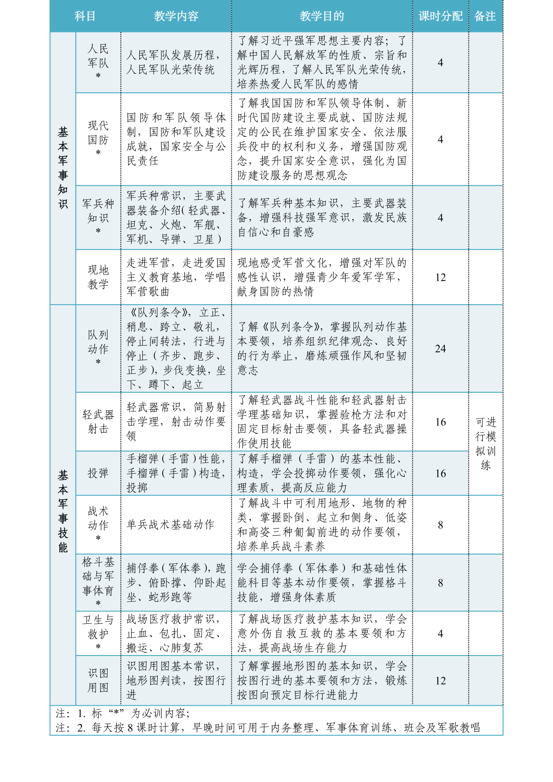 高中阶段学校学生军事训练教学内容含必训内容和选训内容。学校要严格落实《大纲》,不得减少教学内容和规定课时。鼓励学校积极开设有关军事知识、军事技能训练教学方面的校本课程,拓宽军事训练教学内容。