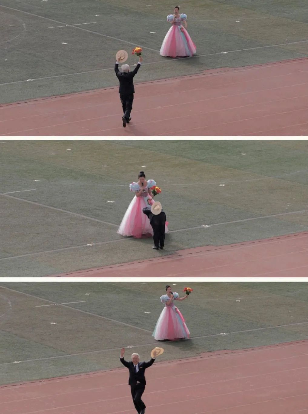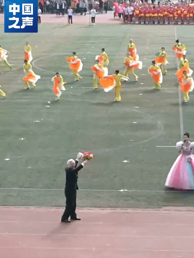 献花结束后,杜老师跑跳着离场
