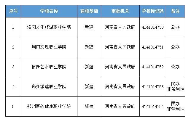 5月11日,教育部正式下发《教育部办公厅关于公布实施专科教育高等学校和成人高等学校备案名单》的函,公布了2021年度省级人民政府审批新设、更名、合并调整、撤销的专科层次高等学校和成人高等学校备案名单。河南省将新设立5所高等职业学校,其中3所公办院校、2所民办院校。