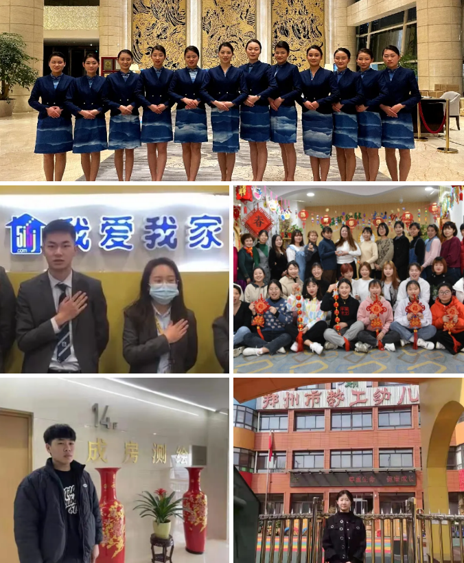 学院与中国石油、海尔集团、郑州宇通、郑州海马、郑州日产、河南高铁工程、河南五建、河南建业、郑州丹尼斯、郑州银行、郑州裕达国贸、河南康辉国旅、郑州瑞兴财务咨询、郑州嵩山饭店、上汽乘用车郑州公司、柒牌服饰、郑州建业小哈佛幼儿园、郑州地铁、北京万寿路俱乐部、国家旅游局北戴河金山宾馆、河南华夏会计师事务所等全国近百家知名企事业单位建立良好合作关系,根据学生不同特点对学生进行针对性培养,加强就业能力和就业思维的培训,使毕业生顺利走上就业岗位。