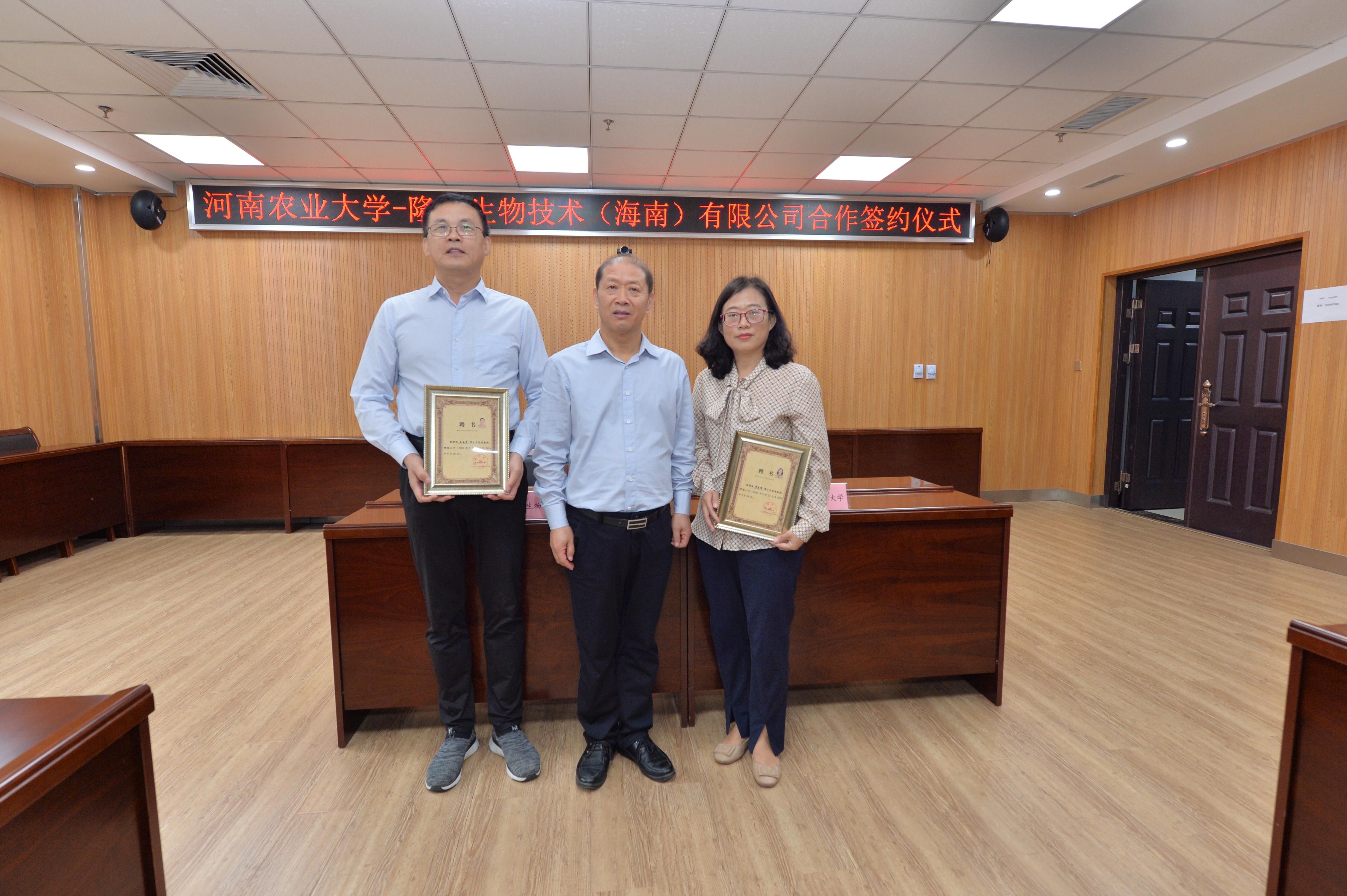 介晓磊为吕玉平博士、贾志伟博士颁发河南农业大学客座教授聘任证书。冯越为汤继华教授颁发隆平生物首席育种家聘任证书。