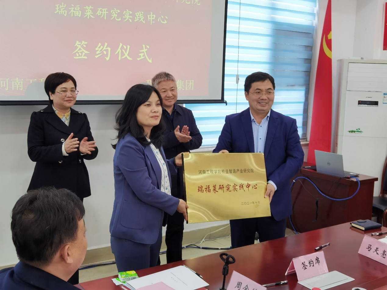 现场,瑞福莱集团董事长刘克强代表瑞福莱集团与河南工程学院签订了“瑞福莱光学膜精益质量管理模式设计与构建项目”合作协议,授予河南工程学院项目组“同意结项证明书”,双方决定成立河南工程学院精益智造产业研究院瑞福莱研究实践中心。