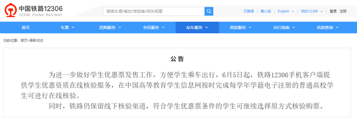 6月5日,中国铁路发布公告:为进一步做好学生优惠票发售工作,方便学生乘车出行,6月5日起,铁路12306手机客户端提供学生优惠资质在线核验服务,在中国高等教育学生信息网按时完成每学年学籍电子注册的普通高校学生可进行在线核验。