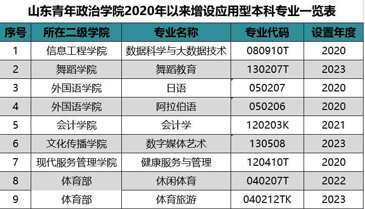 优化专业布局结构,增强服务山东经济社会发展能力。学校主动适应山东省经济社会和产业转型升级的需要,逐步调整优化专业结构,形成以人文社科为主,经济学、法学、教育学、文学、工学、管理学、艺术学等学科专业结构协调发展的格局。积极适应产业结构转型升级的新形势,紧密围绕山东省战略性新兴产业发展,主动对接山东省“十强”优势产业集群和济南市“十大千亿级产业”,努力调整优化专业布局结构,新增设数据科学与大数据技术、健康服务与管理、休闲体育、舞蹈教育、体育旅游等服务产业急需和补齐民生短板等战略性新兴产业服务的应用型专业,聚焦康养文旅,促进学校办学特色的形成。近两年,新增普通本科专业9个,积极为山东文化旅游、健康养老服务新业态服务。