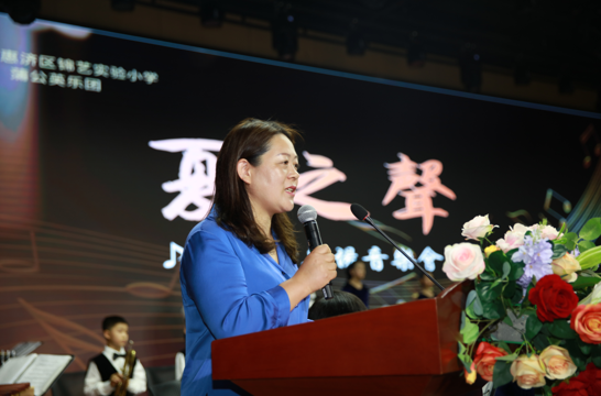 最后,锦艺实验小学校长曹金凤为本场音乐会作总结发言。曹金凤表示,蒲公英管乐团是由学校以整个班级编制的形式组建的首届管乐团班,优化统筹艺术训练和学科学习,同时配备有资深的艺术指导专家团队,并由市优秀班主任担任专职班主任。60个孩子们怀揣着对音乐的美好憧憬,在指导教师的殷殷教诲下,倾注了大量的心血与汗水,晨起与旋律相伴,夜晚与乐器相随,自由生长,收获满满。并先后受邀参与各级各类汇报演出活动20余次,成为惠济教育令人瞩目的优秀艺术团队,同时,也促使“品•艺”课程成为锦小教育闪亮的名片。她指出,本次专场音乐会的成功举办,不仅是一次校园艺术文化的盛会,也是学校“品•艺”课程之艺术课程的成果展示,为学生全面发展、张扬个性搭建了平台。
