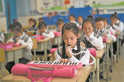 山东省潍坊市奎文中学(小学部)的音乐课上,学生们专心致志地学习吹奏口风琴,感受音乐之美。曹洪文 摄