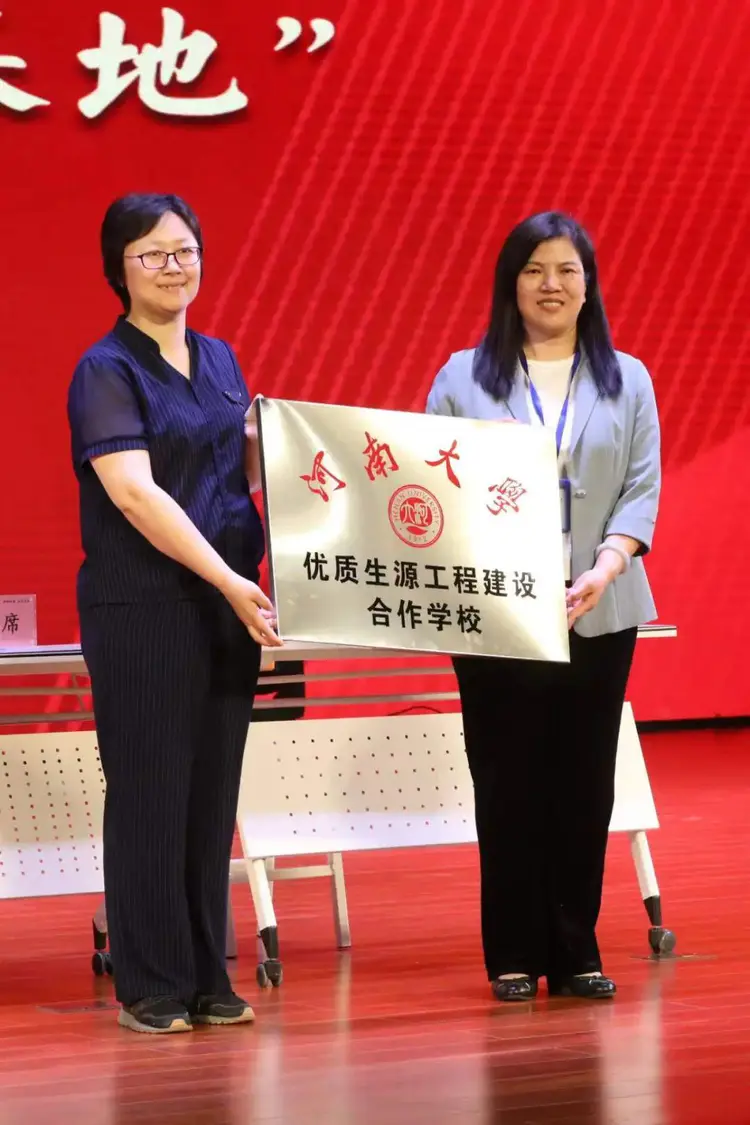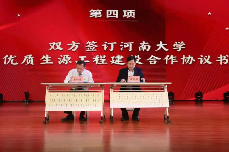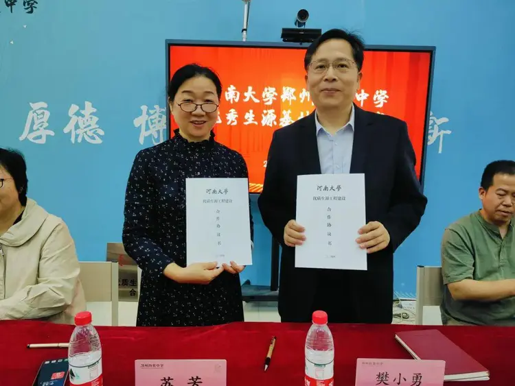 樊小勇指出,郑州市第十八中学是一所历史悠久的学校,多年来为河南大学输送了众多优秀毕业生,双方有着深厚的友谊。他希望有更多学子报考百年学府河南大学,双方携手共同探索培养高质量人才的新路径,并与魏勇现场签订了河南大学《优质生源工程建设合作协议书》。周青向段亚萍授予“河南大学优质生源工程建设合作学校”牌匾。