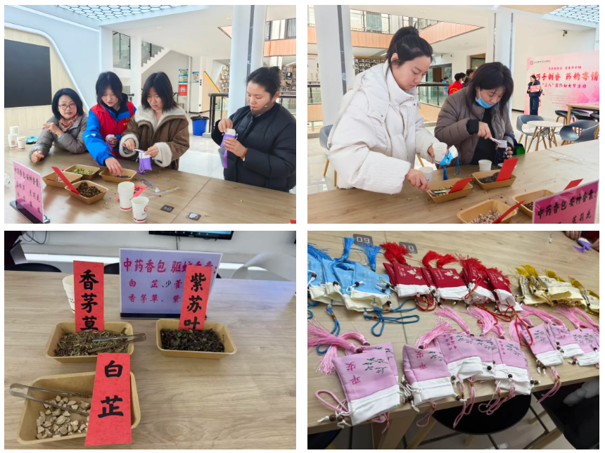 活动现场准备了安神助眠、驱蚊防虫、健脾助消化、温阳驱寒等多种功效的中药香包材料。寇付生主任通过望闻问切为教职工逐一进行体质辨证,并根据个人体质特点,指导大家挑选中药材、调配制作专属中药香包。该环节不仅让大家切身感受传统中医文化的独特魅力,更为自身健康增添了一份贴心守护。
