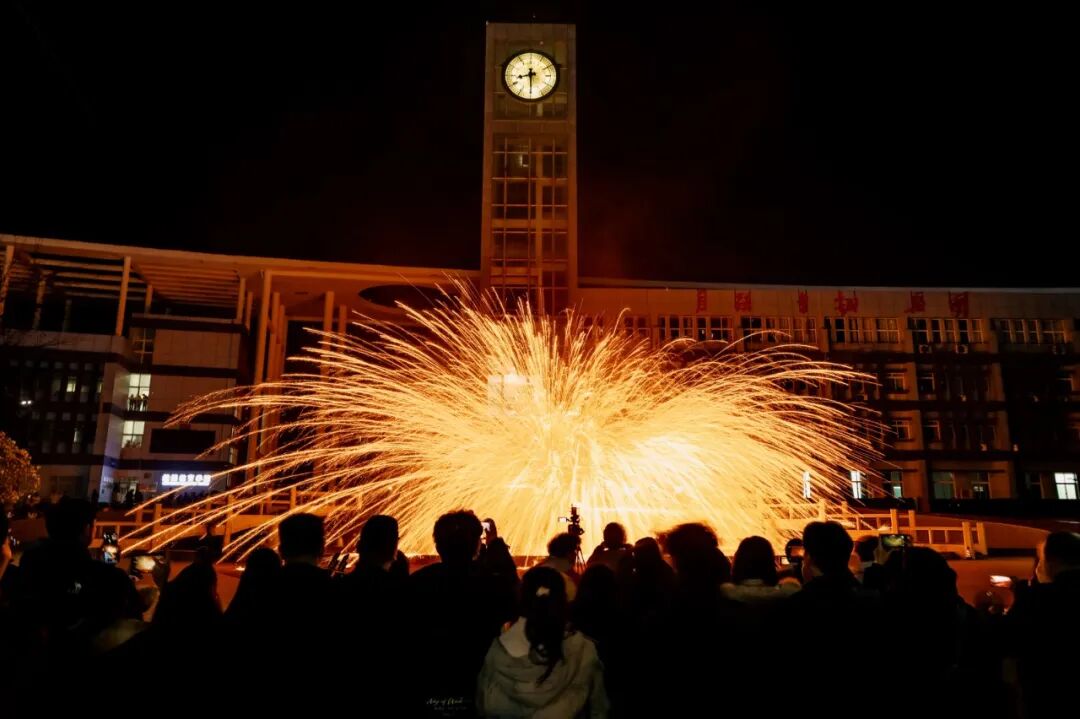 值得一提的是,活动现场,八匹骏马身披红绸盛装亮相,化身专属“开学大使”,寓意全体学子新学期策马扬鞭、奋勇争先,学子们纷纷轻抚马鬃、合影留念,尽赏“春风得意马蹄疾”的豪情盛景。夜幕降临,国家级非遗“打铁花”表演将氛围推向高潮,匠人将1600℃铁水凌空挥洒,铁花飞溅、星火漫天,宛若银河倾泻,尽显千年非遗的震撼壮美。这场视觉盛宴,不仅让学子领略非遗魅力,更让大家体悟匠人精益求精的坚守,厚植文化自信与家国情怀。