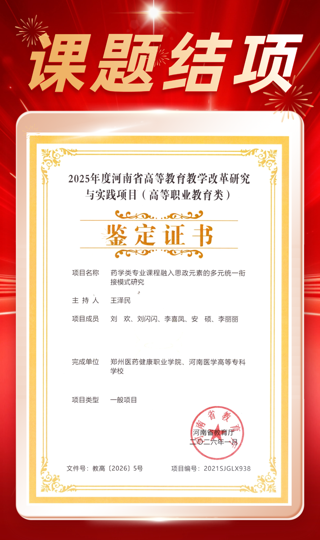 该校有关负责人表示,郑州医药健康职业学院将以此次教改项目圆满结项为契机,持续深化课程思政理论研究与实践探索,不断完善“多元统一”育人模式,强化成果转化与示范引领功能,切实为培养德技并修的高技能药学人才筑牢思想根基、夯实育人保障,为服务区域医药健康产业高质量发展贡献更大力量。(朱奕璇)